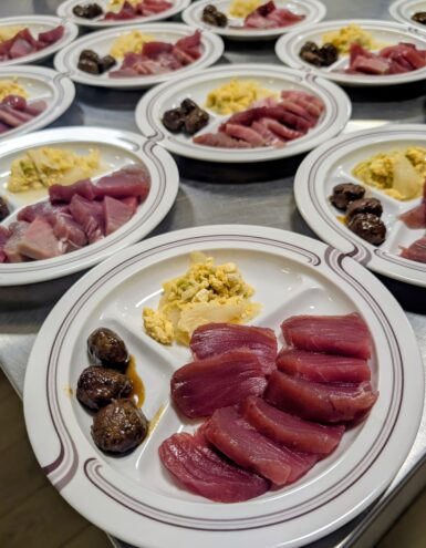 入院中に誕生日を迎えてお祝いできなかった入居者さんに-60℃で保存してあった本マグロでダブルお祝いしました。副菜はご勘弁…